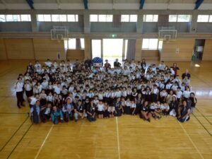 まずは校歌と「ふるさと」の合唱があり、次に勝ち残りじゃんけんを英語で行った後、備後絣の説明を甲斐さんより行い、「備後絣音頭をつなぐ会」と全員で「備後絣音頭」を踊りました。海外11か国からの教育関係者11人には法被を着てもらい、マスコットキャラクターの「かすりん」もみんなに愛され一緒に楽しく踊りました。