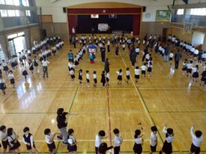 岡山大学がJICA(独立行政法人国際交流機構)に協力して実施する活動の一環で、3時間目に5年生の算数の授業の見学をした後4時間目に体育館で交流会が開かれました。