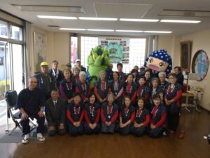 今年も好天に恵まれ、網引地区のマスコット「あすじろう」を先頭に、地域の方と備後絣音頭をつなぐ会で総勢27名で踊りを披露しました。しんがりには「かすりん」も参加し多くの方々に「備後絣音頭」を楽しんでいただきました。