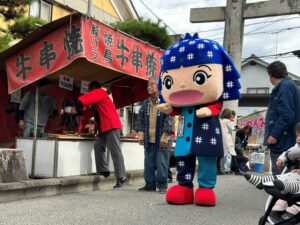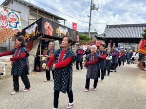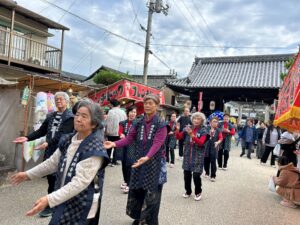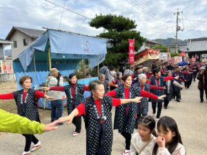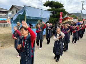 今年も好天に恵まれ、網引地区のマスコット「あすじろう」を先頭に、地域の方と備後絣音頭をつなぐ会で総勢27名で踊りを披露しました。しんがりには「かすりん」も参加し多くの方々に「備後絣音頭」を楽しんでいただきました。