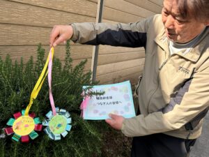 玄関を入ると子どもたちからきれいな手作りメダルを首からかけてもらい体育館に案内されました。